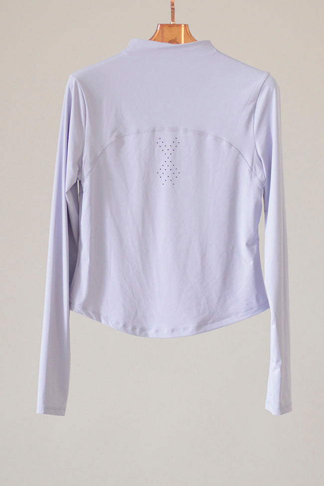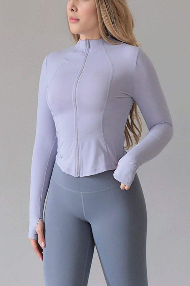 Ideal para usar en climas frescos o durante el calentamiento, cuenta con cierre frontal completo y aberturas para los pulgares que añaden practicidad y un toque deportivo elegante.