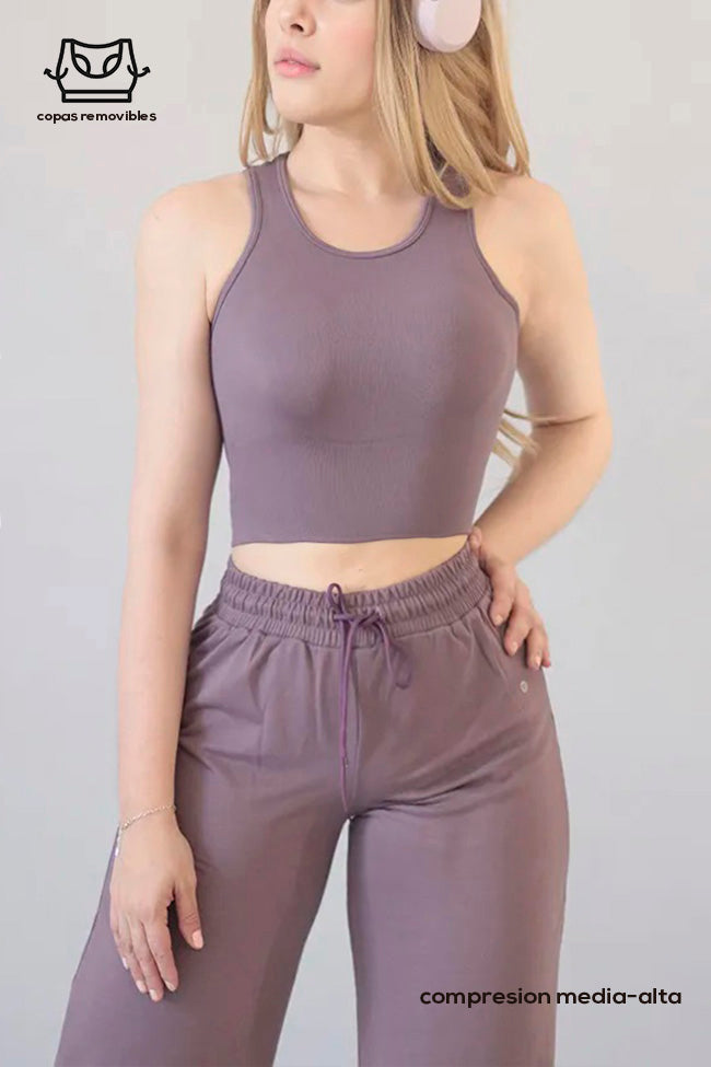 • Corte Racerback Estilizado: Diseño de cuello redondo y sisa amplia que permite una libertad de movimiento total en hombros y brazos, ideal para entrenamientos de tren superior o yoga.