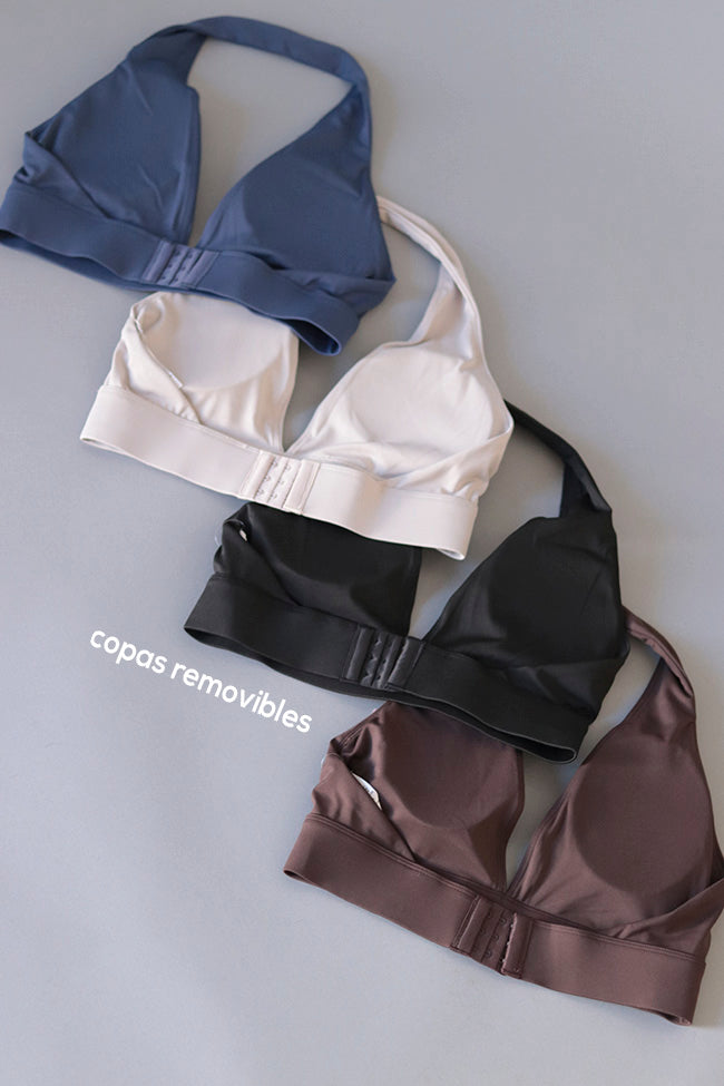 Eleva tu entrenamiento con una dosis de elegancia clásica. Este top en color chocolate profundo destaca por su diseño tipo halter y un favorecedor escote en V, que estiliza el torso y realza el busto con un toque de lujo atemporal 🤎💫